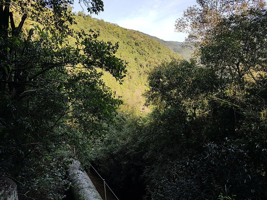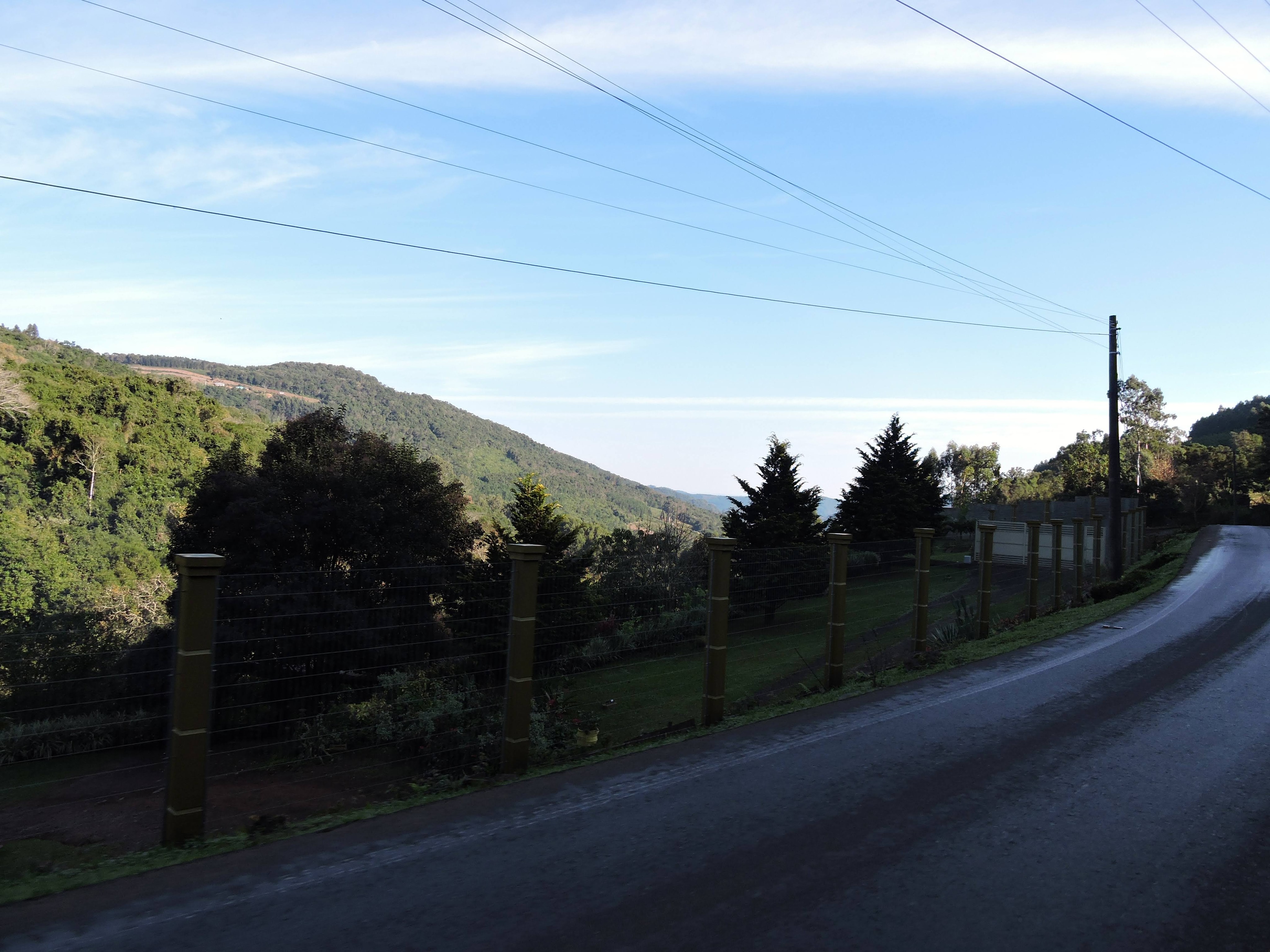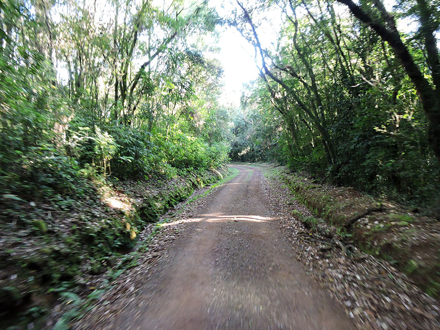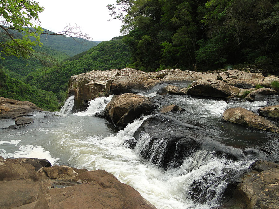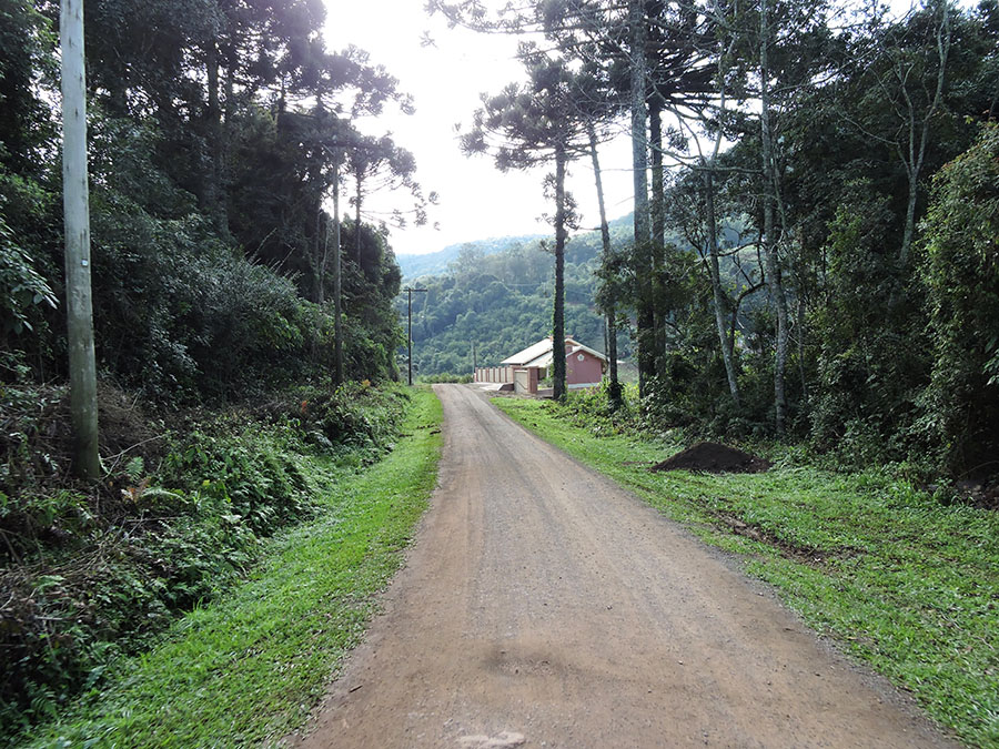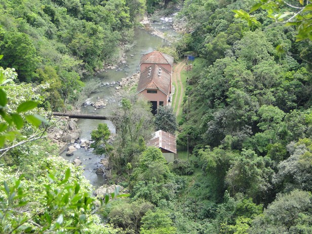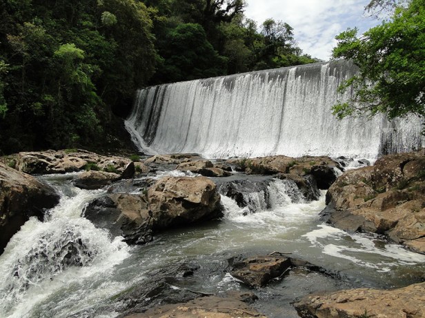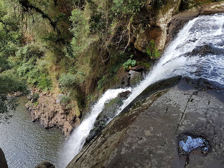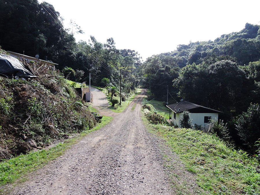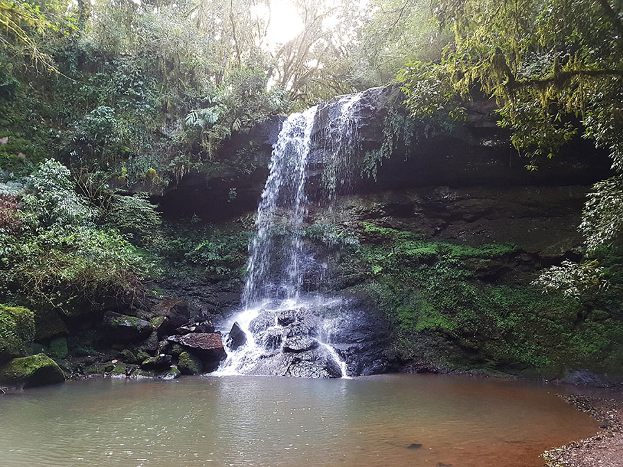 Logo na entrada do município fica o acesso à primeira cascata, meu conselho é ficar atento ao GPS, pois não há sinalização. Um ponto de referência é a “oficina mecânica” da foto abaixo. Quando chegar nela, pegar a rua lateral, de paralelepípedo (rua Walter Fleck), andar cerca de 200 metros e entrar à direita, em uma rua de chão batido. Infelizmente só é possível ter uma vista de cima da cascata, mas vale a pena, pois a paisagem é linda. O acesso a parte debaixo da cascata se dá pela área privada da usina de energia (fechada a visitação pública).