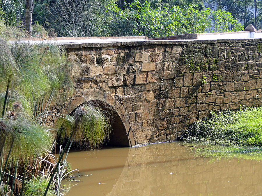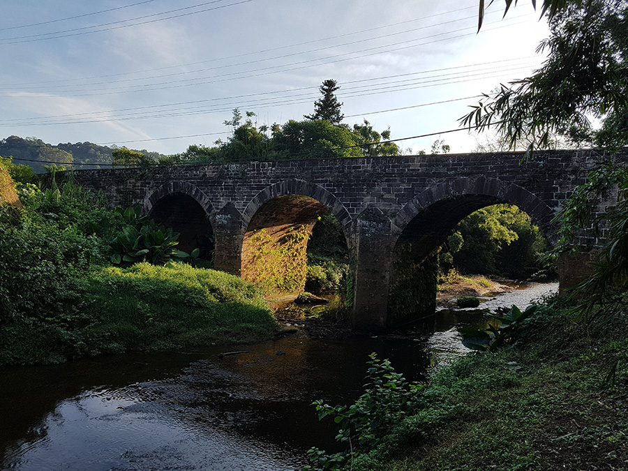Classificada como estilo romano, a ponte tem 148 metros de comprimento e largura que varia de 7,7 a 14,2 metros. Construída em pedra grés empilhada e encaixada, com uso de cimento apenas nas colunas que ficam dentro da água e três grandes arcos por onde passam as águas do Arroio Feitoria.