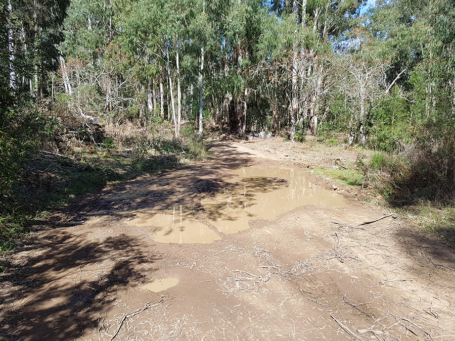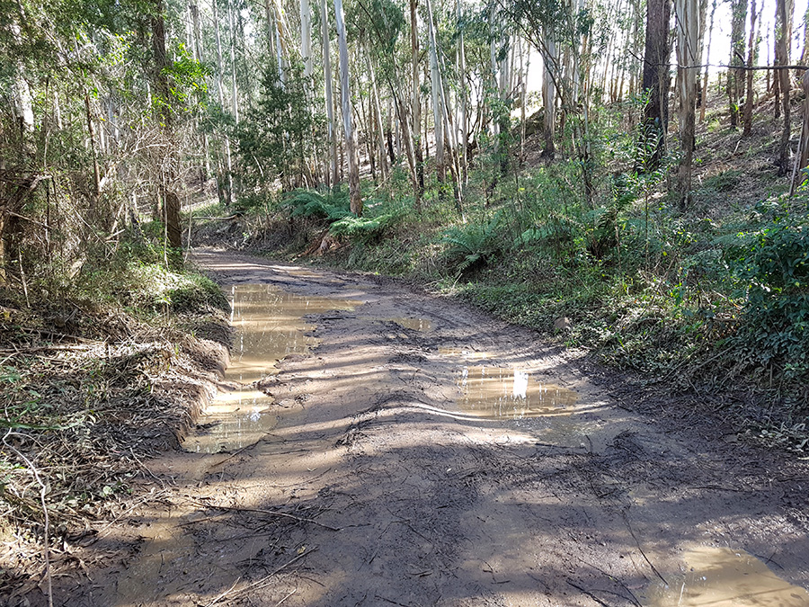 Este segundo trecho é um pouco menos ruim, com menos pedregulhos, mas com algumas partes de água empoçada e estrada escorregadia. Na verdade a parte mais lisa da estrada é uma pequena subida, não é tão íngreme, mas quando úmida requer atenção redobrada, principalmente na volta.