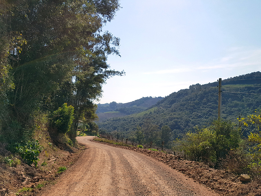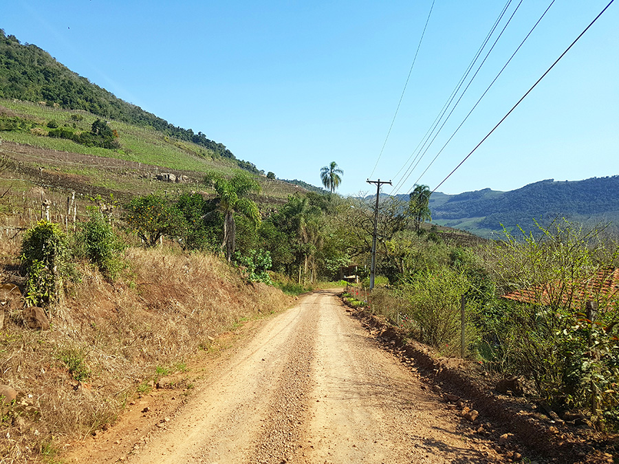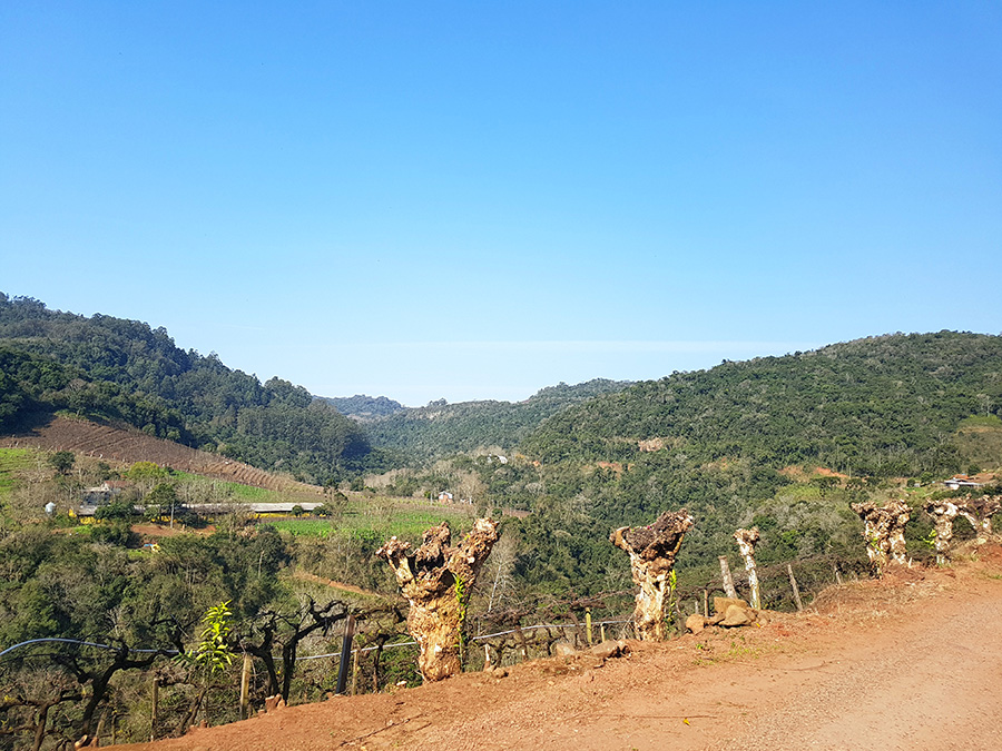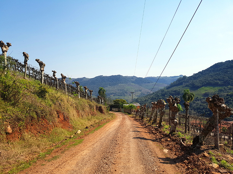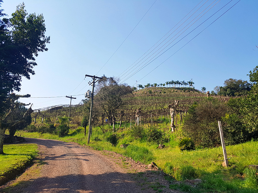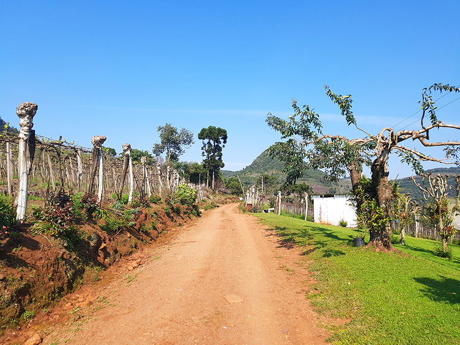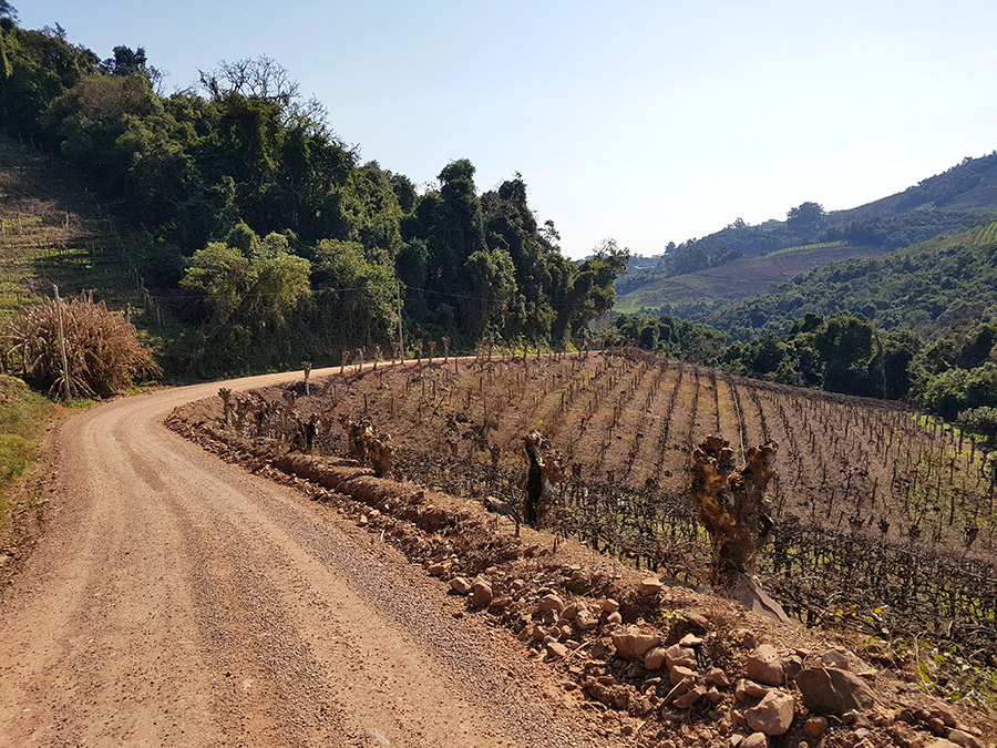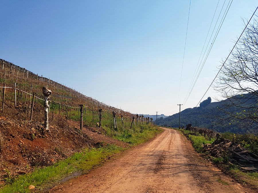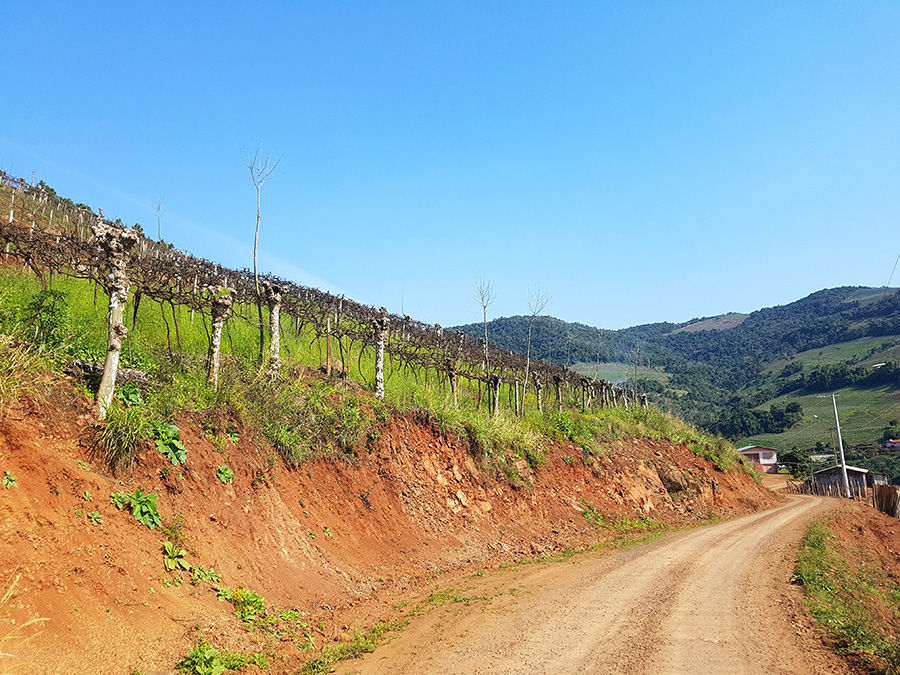 Diversos parreirais, geralmente em uma topografia acidentada. A paisagem da estrada é formada por montanhas, vales e um incrível paredão de pedras, onde no alto, está situado o Parque Gasper.