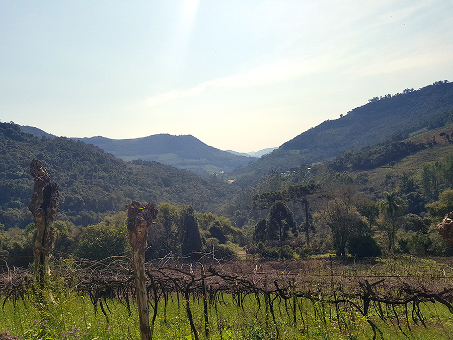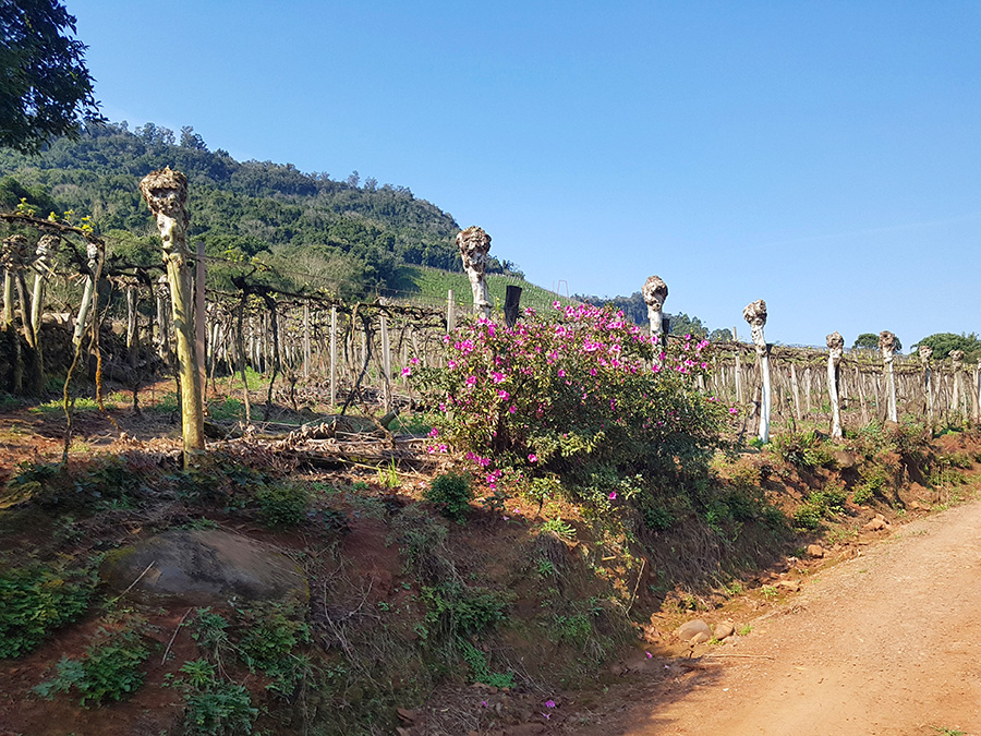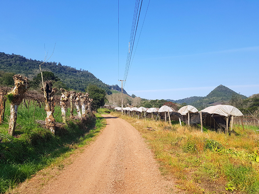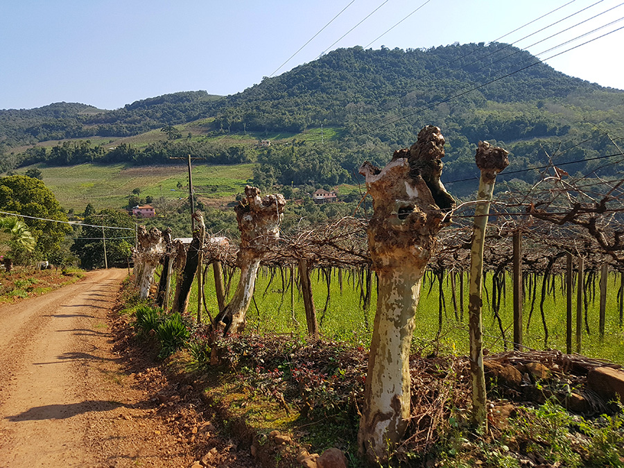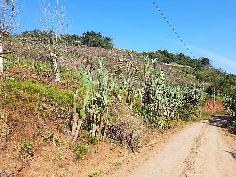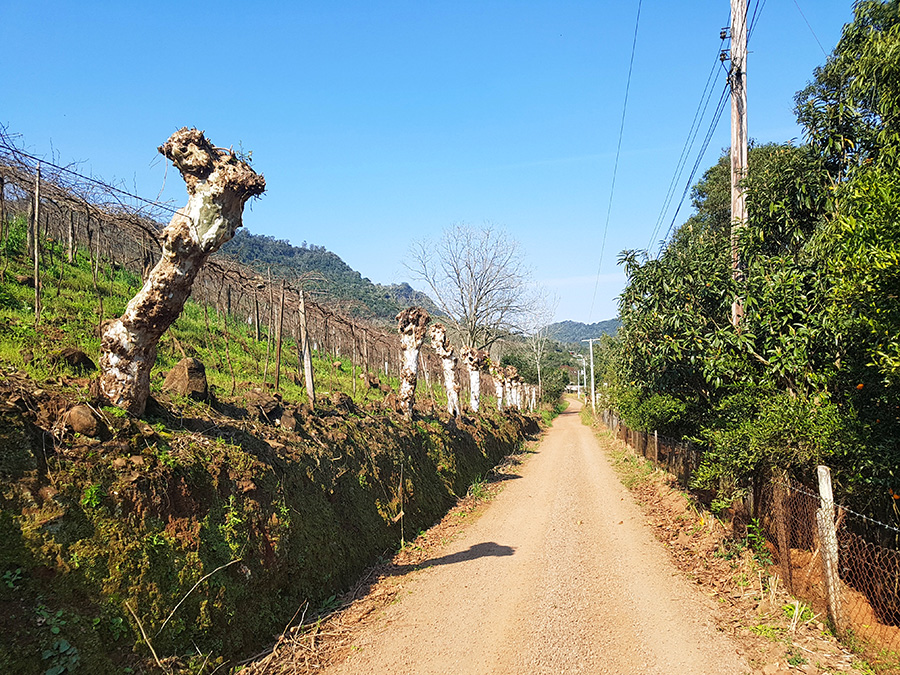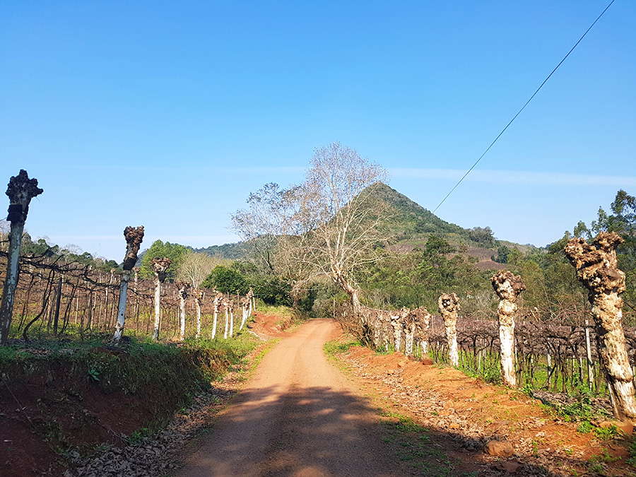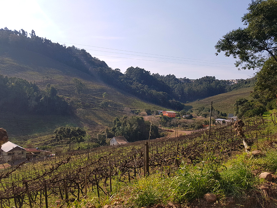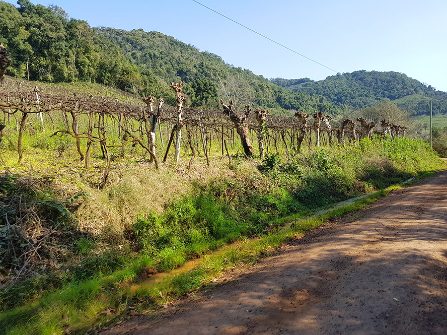 Diversos parreirais, geralmente em uma topografia acidentada. A paisagem da estrada é formada por montanhas, vales e um incrível paredão de pedras, onde no alto, está situado o Parque Gasper.