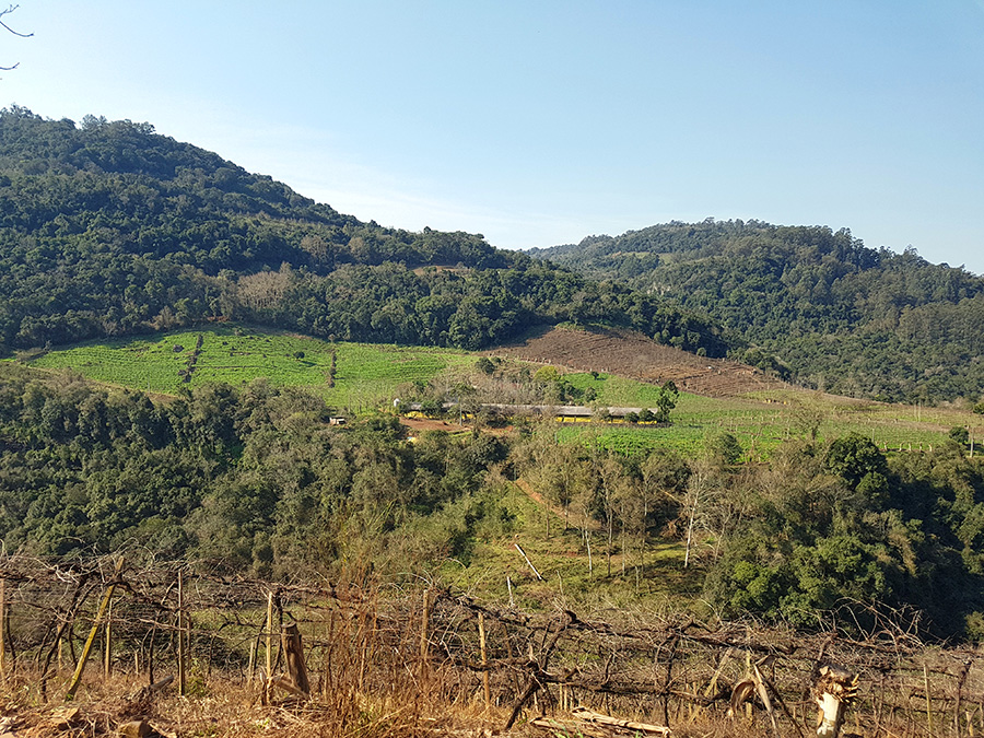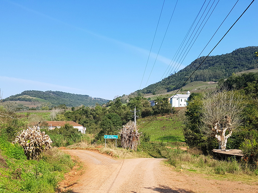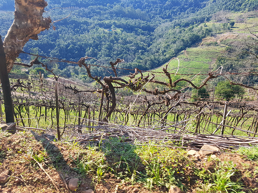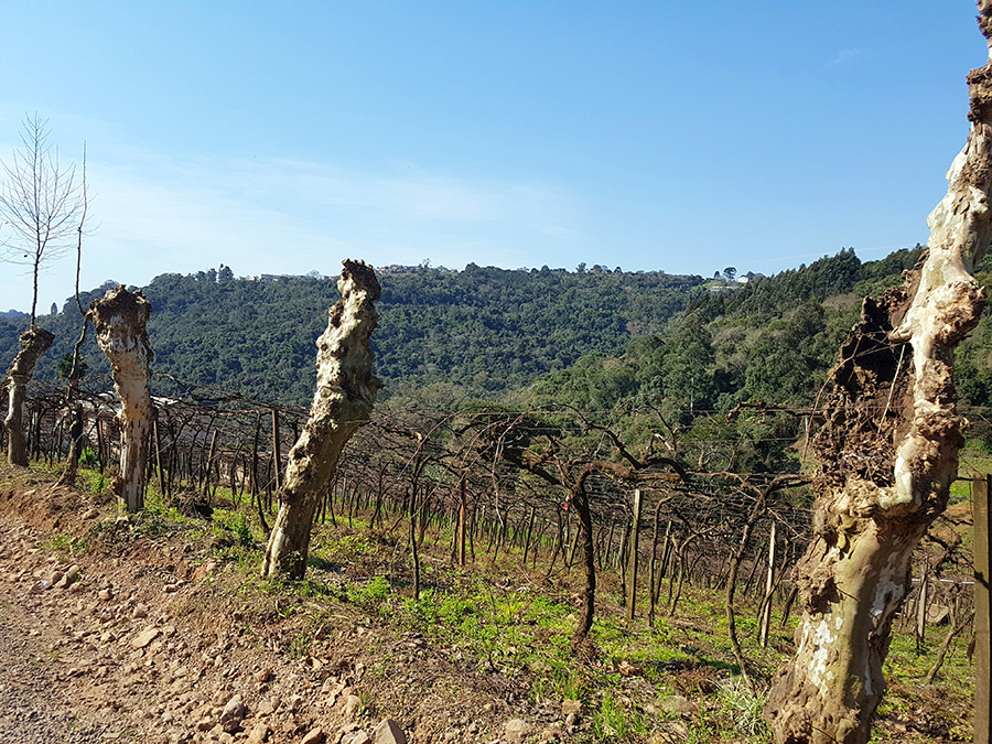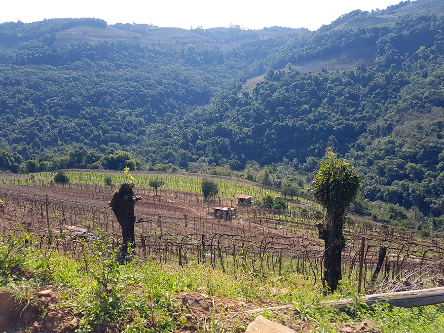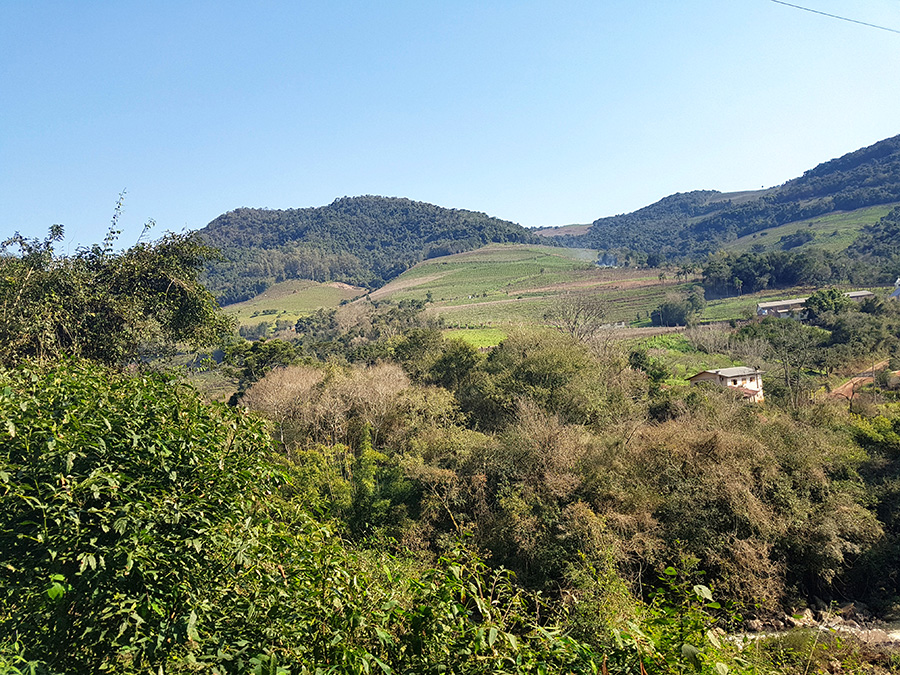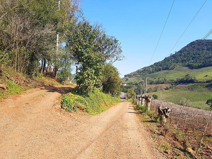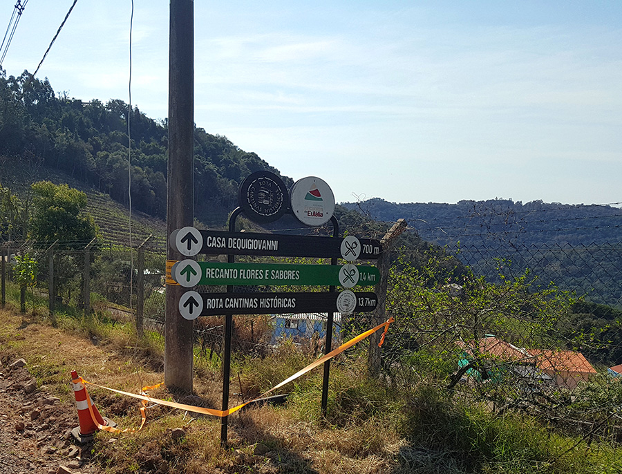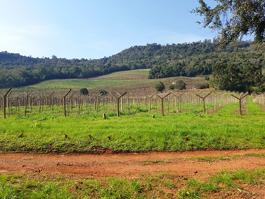 Diversos parreirais, geralmente em uma topografia acidentada. A paisagem da estrada é formada por montanhas, vales e um incrível paredão de pedras, onde no alto, está situado o Parque Gasper.