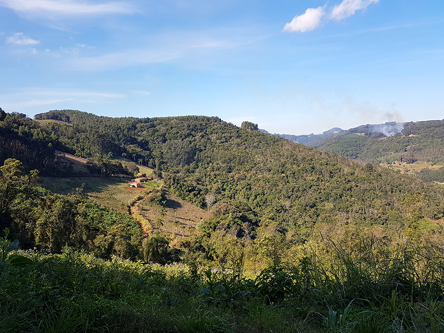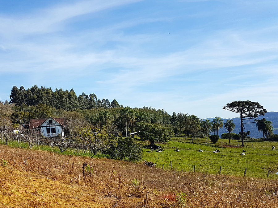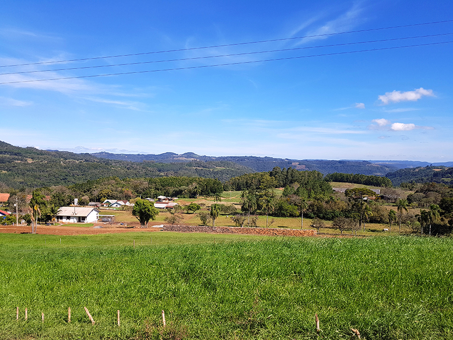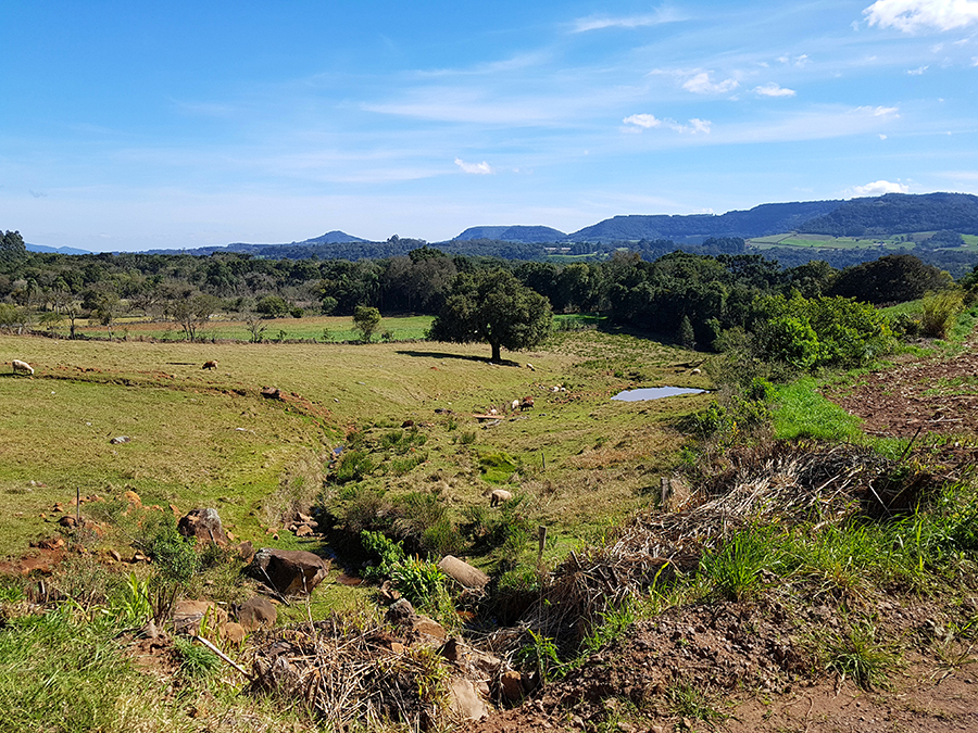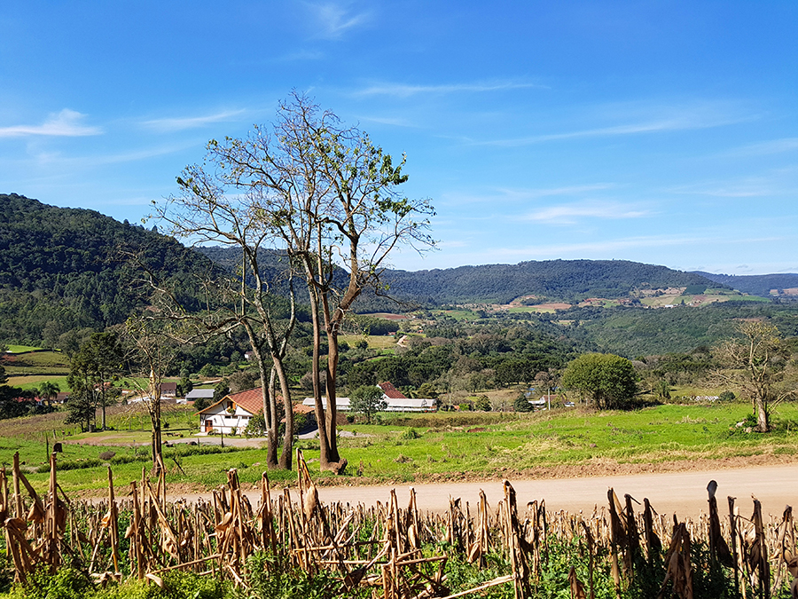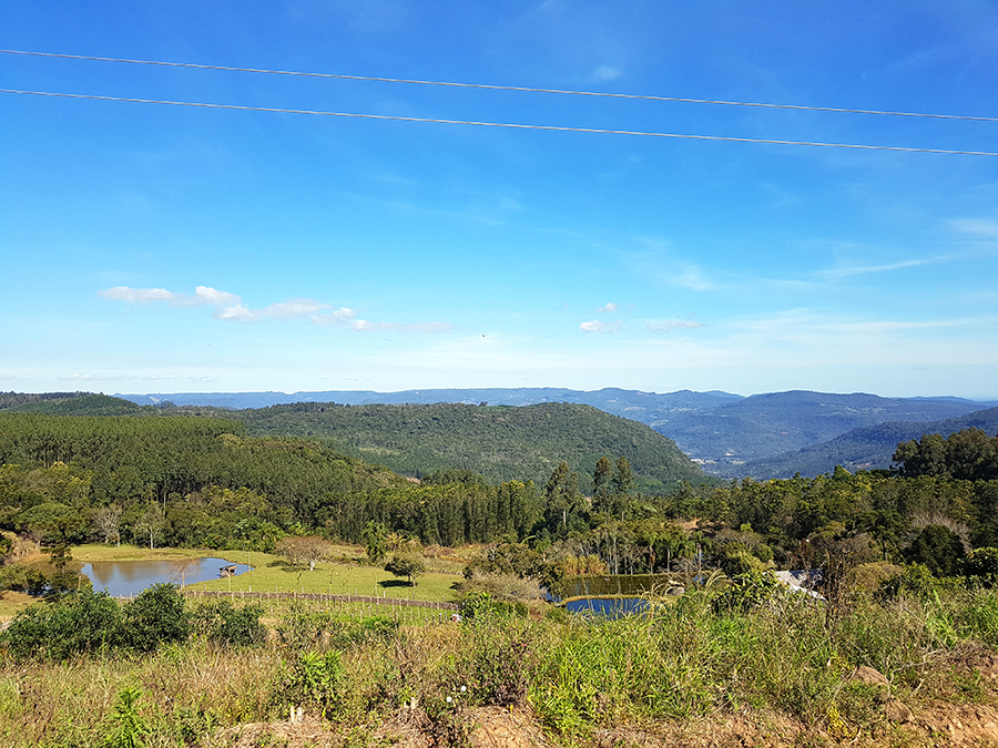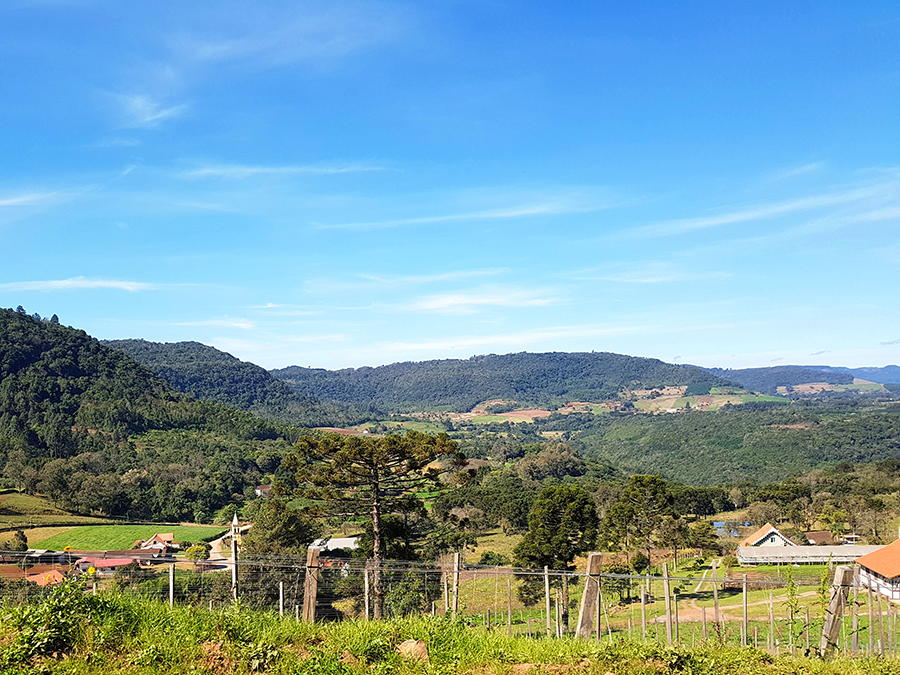 Uma paisagem de tirar o fôlego, com diversas propriedades rurais, animais no campo, tudo isso cercado por morros e vistas panorâmicas de toda região.