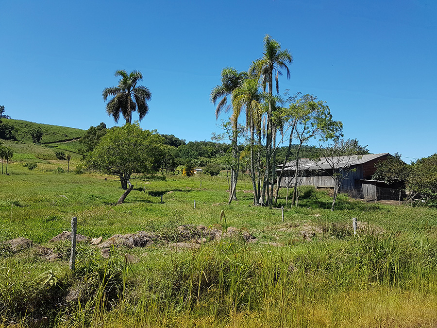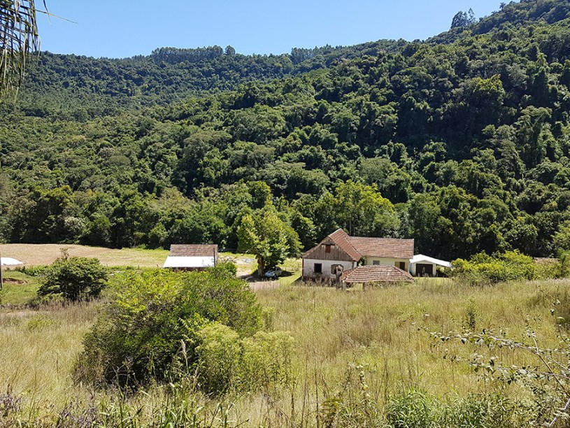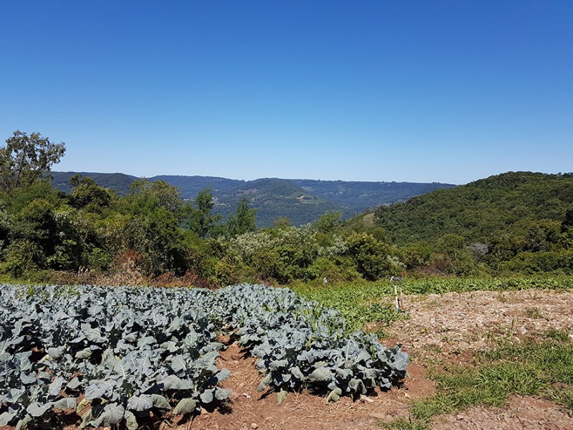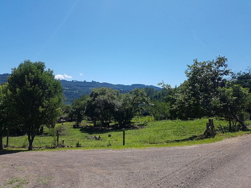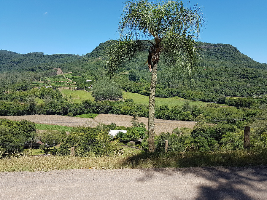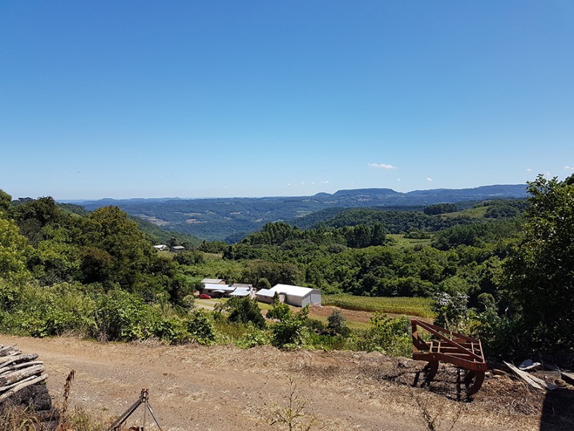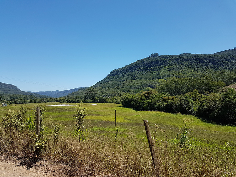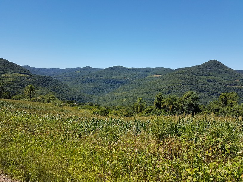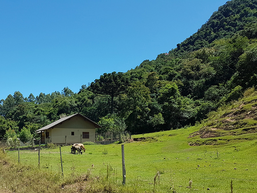 Paisagens rurais em meio aos morros de Santa Maria do Herval, animais no pasto e plantações de verduras, entre outras.