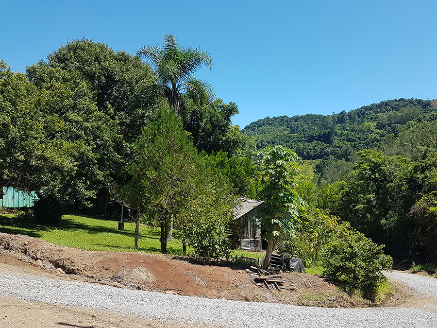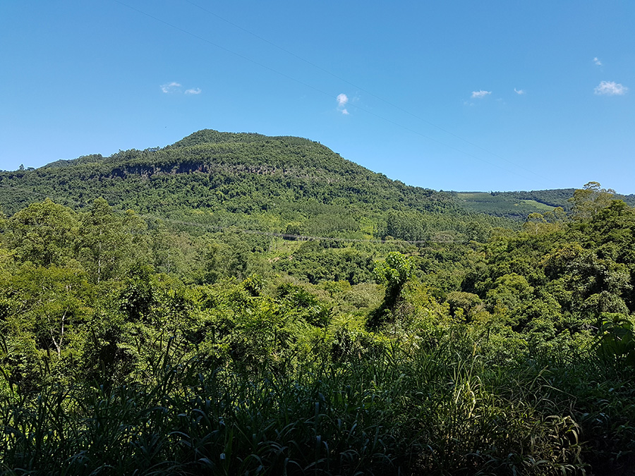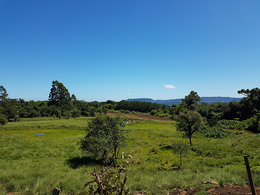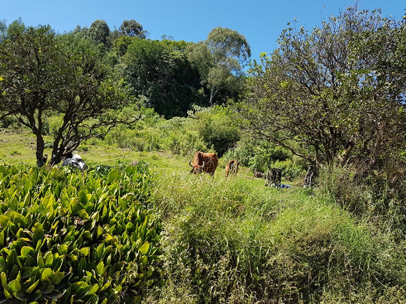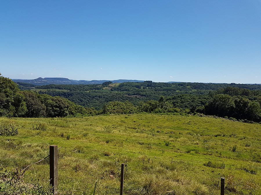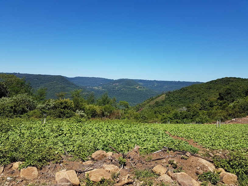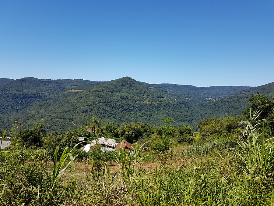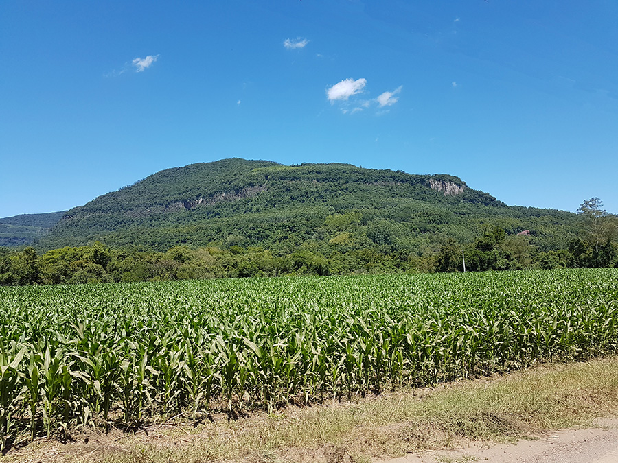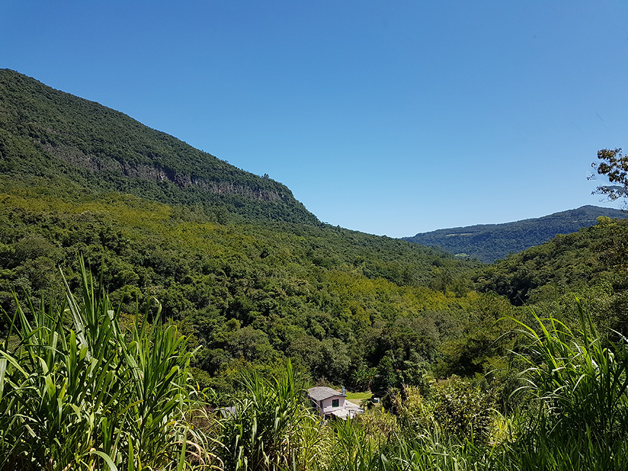Paisagens rurais em meio aos morros de Santa Maria do Herval, animais no pasto e plantações de verduras, entre outras.