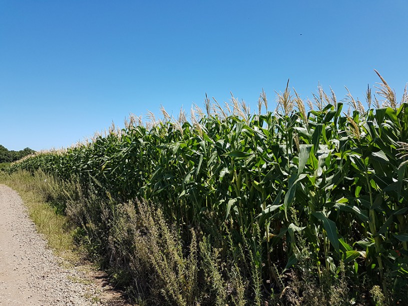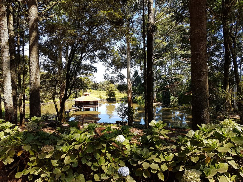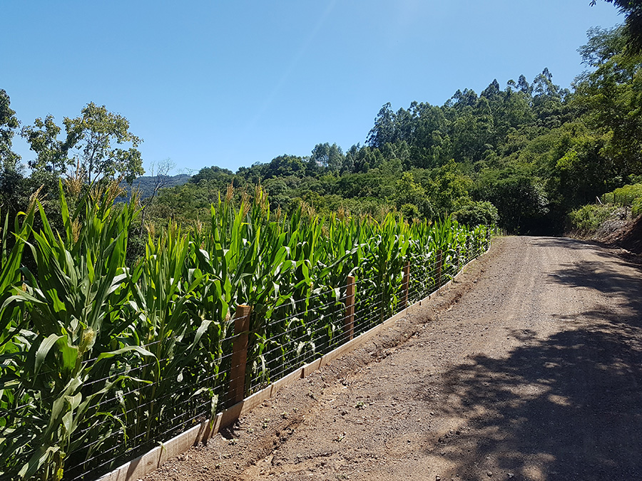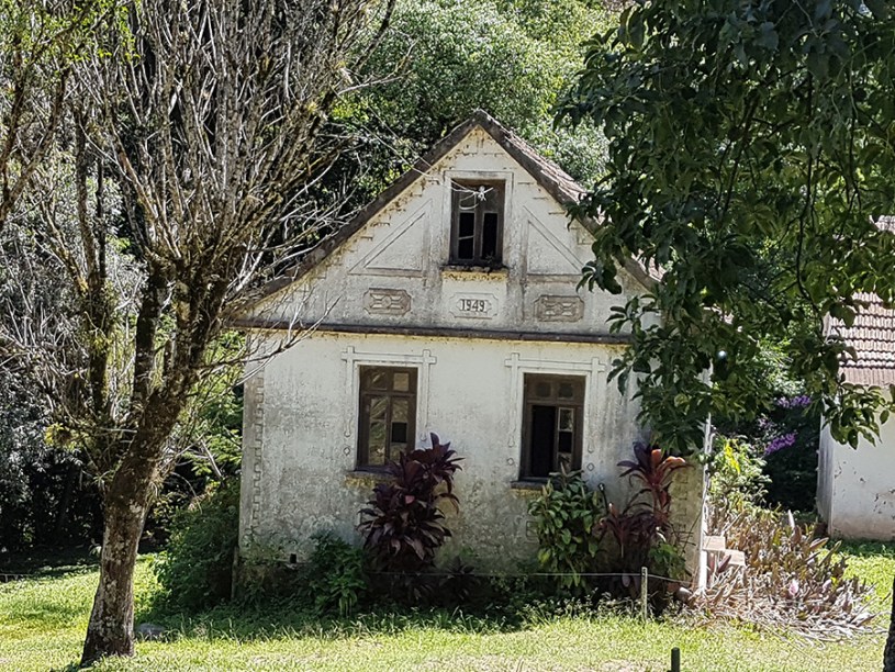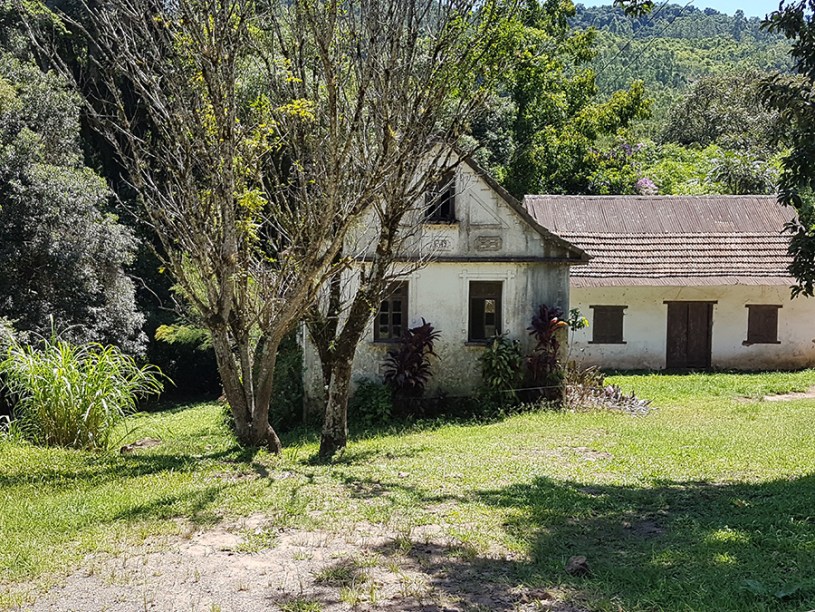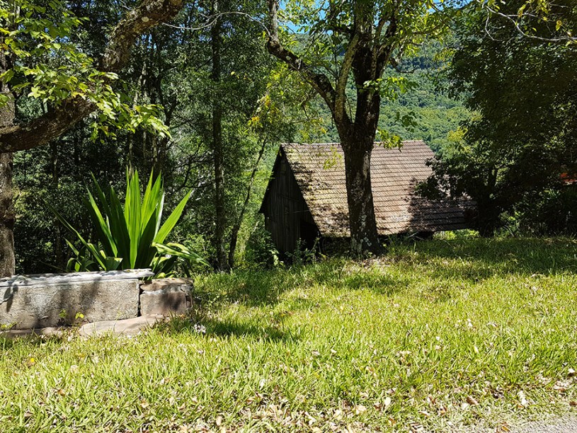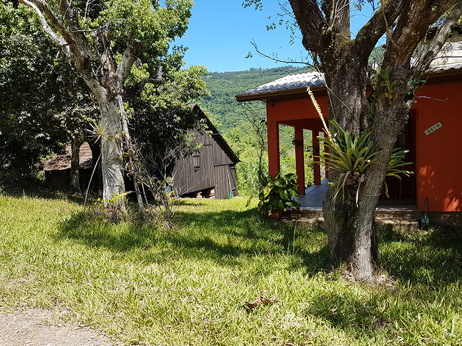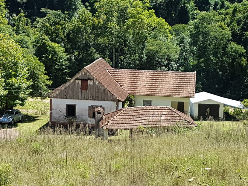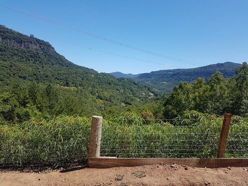 Paisagens rurais em meio aos morros de Santa Maria do Herval, animais no pasto e plantações de verduras, entre outras.