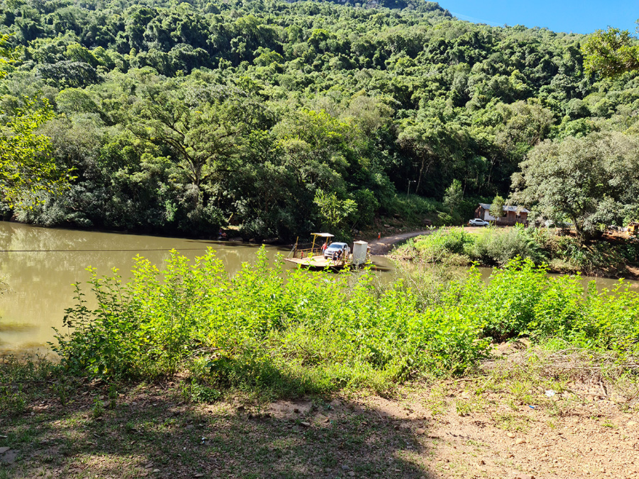 O acesso se dá por uma rua de estrada de chão, pouco antes da ponte Ernesto Dorneles.