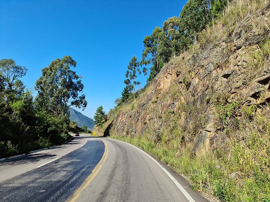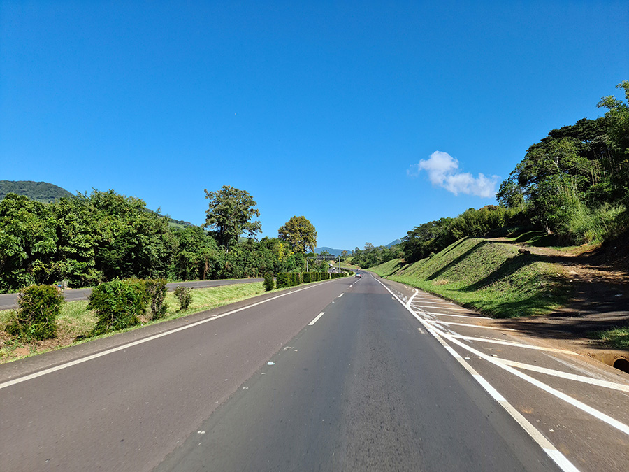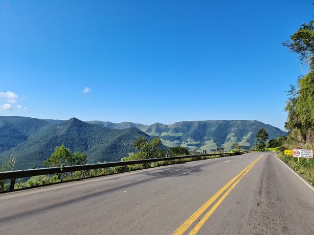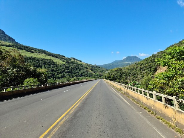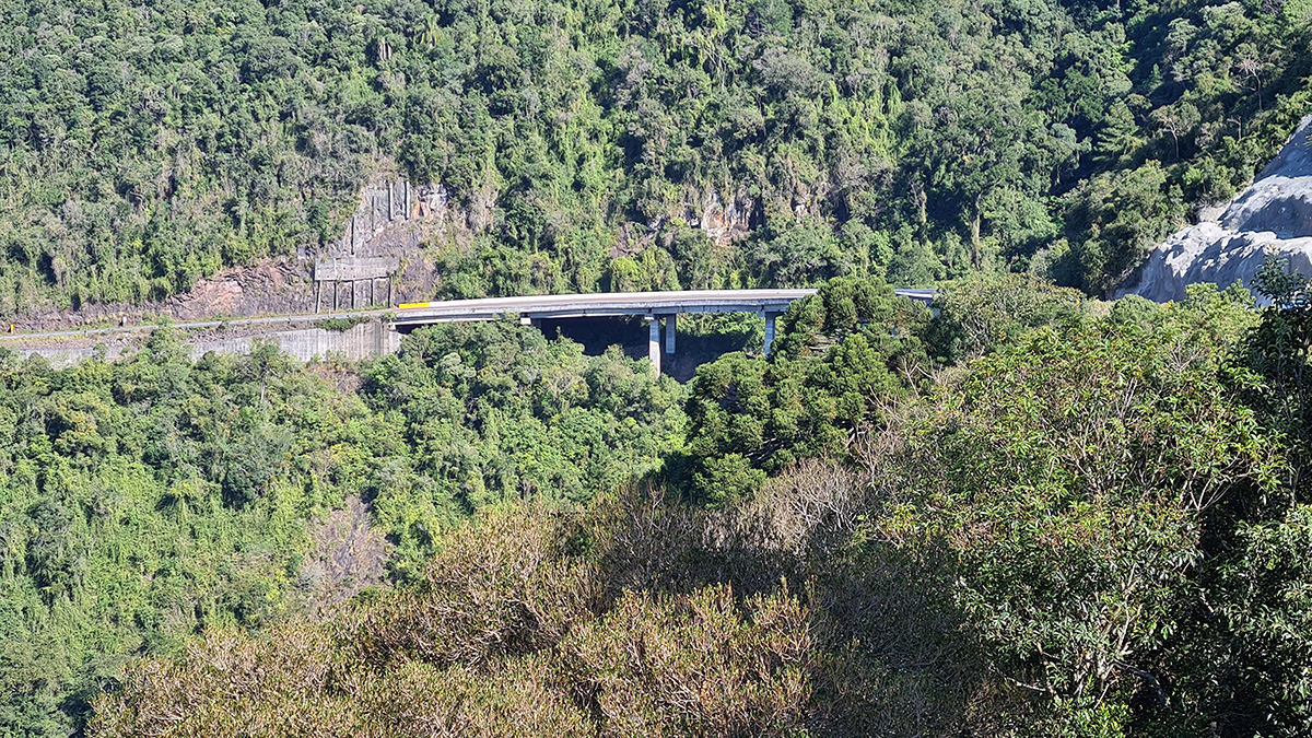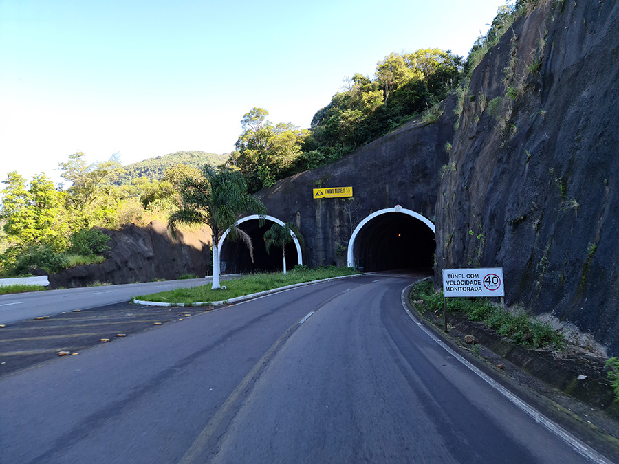 Linda rodovia em meio a Mata Atlântica, cercada por morros e belas paisagens, passando por dois túneis.
